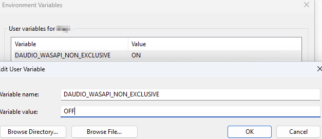 Go to the Windows "Environment Variables" screen and set DAUDIO_WASAPI_NON_EXCLUSIVE from ON to OFF. If you can not see this line, please add it.